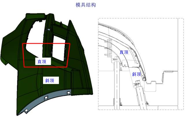 如下图所示,产品两头采用直顶+斜顶的机构进行脱模。