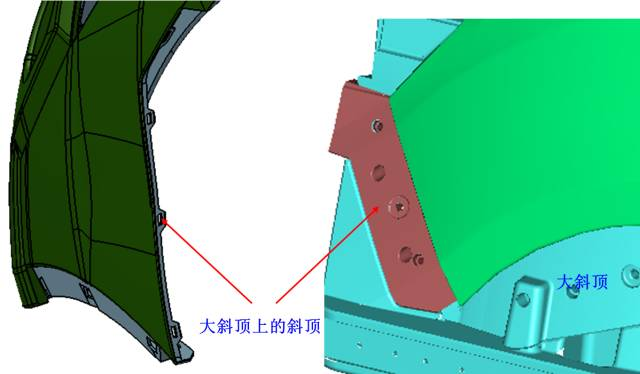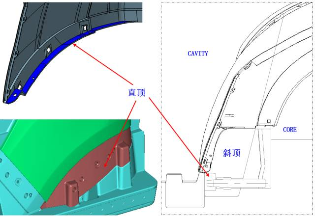 下图所示产品底部蓝色处采用在大斜顶上设计直顶的结构,使产品在顶出时以防产品顶出时同斜顶走。