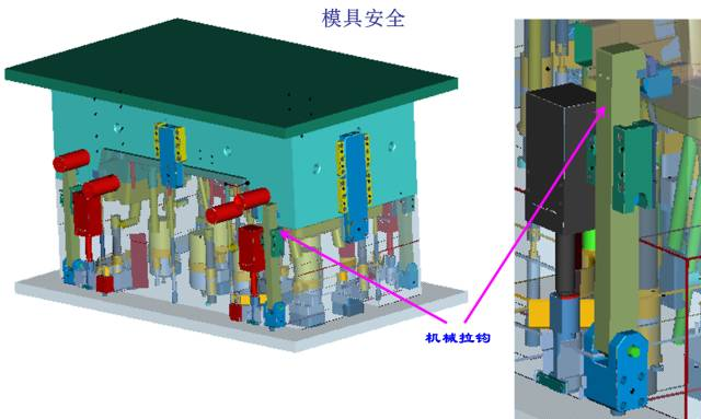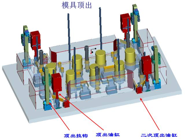 (1)第一级顶出采用4个油缸顶出同前模同步运动顶出60MM,4个拉钩为辅助机构;