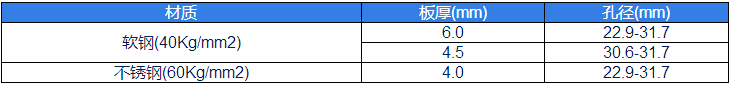 材质板厚(mm)孔径(mm)软钢(40Kg/mm2)6.022.9-31.74.530.6-31.7不锈钢(60Kg/mm2)4.022.9-31.7