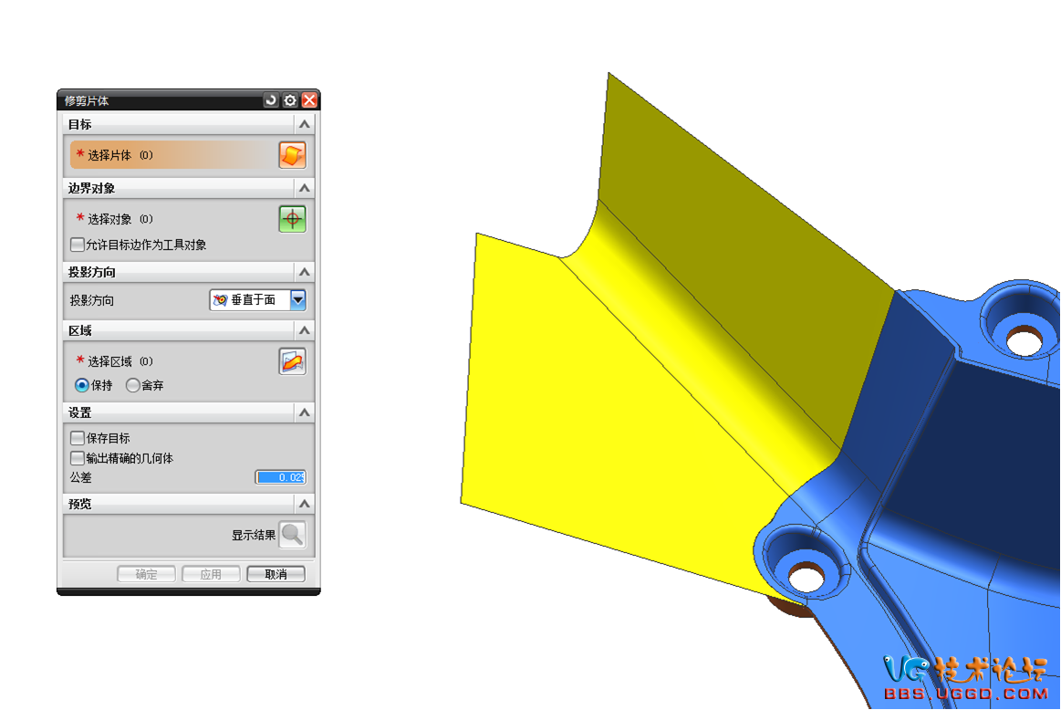 4.利用“修剪片体”命令将伸到产品里面的分型面修剪掉,结果如图所示
