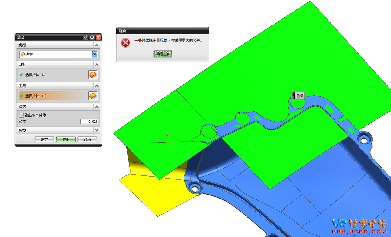 6.用“缝合”命令将两个绿色面缝合起来,发现两个面之间公差间隙太大无法缝合,碰到这种情况,我们只能考虑做面,将大的绿色面用“修剪体”命令修剪掉一部分,如图所示