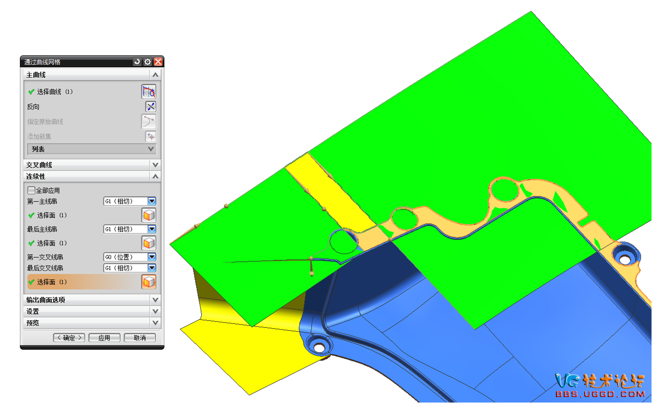 8.用“通过曲线网格”命令创建分型面,并约束三个面G1相切,结果如图所示