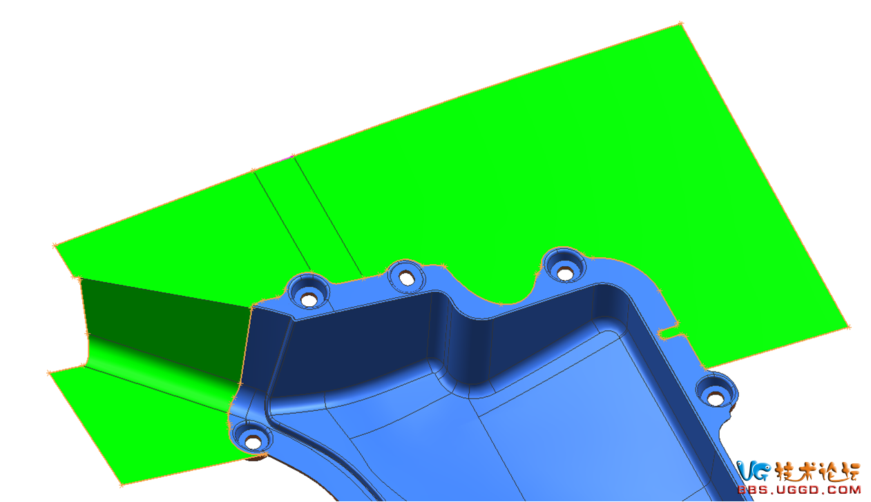 9.将三个面缝合起来,利用“修剪片体”命令将伸到产品里面的分型面修剪掉,结果如图所示